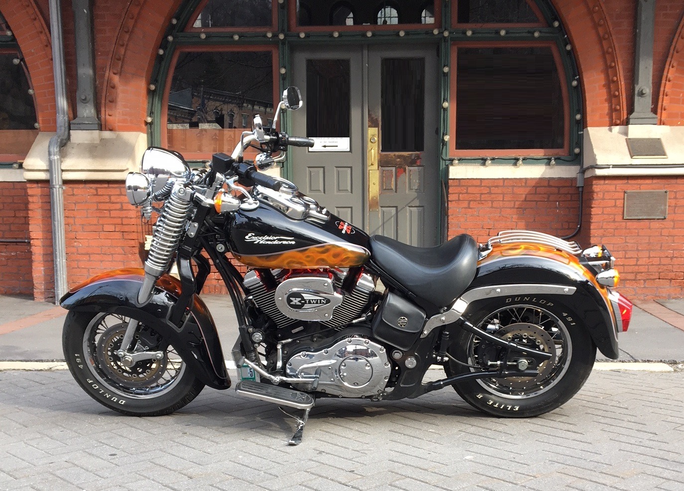 | Modifications/Accessories: | Driving lights. Sissy Bar (Not installed) 1. Transmission (Done by Phil Marks back in the day) 2. Oil Cooler 3. Oil Breather Relocation 4. Pickup tube enlargement 5. Shift Kit (Done by Phil Marks with tranny/oil cooler/oil breather) 6. Rear Wheel Hub Sleeve (Atlantic EH) 7. Super X Tune (Atlantic EH) 8. Custom Fender support backrest replacement inserts (Made by Me) 9. Ignition Bracket Upgrade (From Atlantic EH) 10. Re-enforced Kickstand (From Atlantic EH) 11. Custom Paint with "EH lines" 12. Battery Box rubber interior Inlay 13. Leather Battery Box Tool Bag with EH Logo 14. New Dunlop Delta Elite II Tires 15. New 550cca X-Rated Gel Battery with integral battery tender. (From Throttle-X Batteries) 16. Red LED’s under the right side of the tank to highlight the cutouts. 17. Deadwood Air Cleaner. 18. Kickstand extender. 19. Motherwell "Holy Grail" rear fender rack. Her name is Bettie.. |