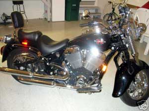 Windshield, Slash cut pipes, Highway bars, Sissy bar w/ pad. Hot Topper bolt toppers, Custom seat,
