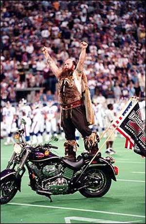 This bike was built for the Minnesota Vikings football team and ridden by Ragnar at the Dome!. It has the team colors of purple and silver.