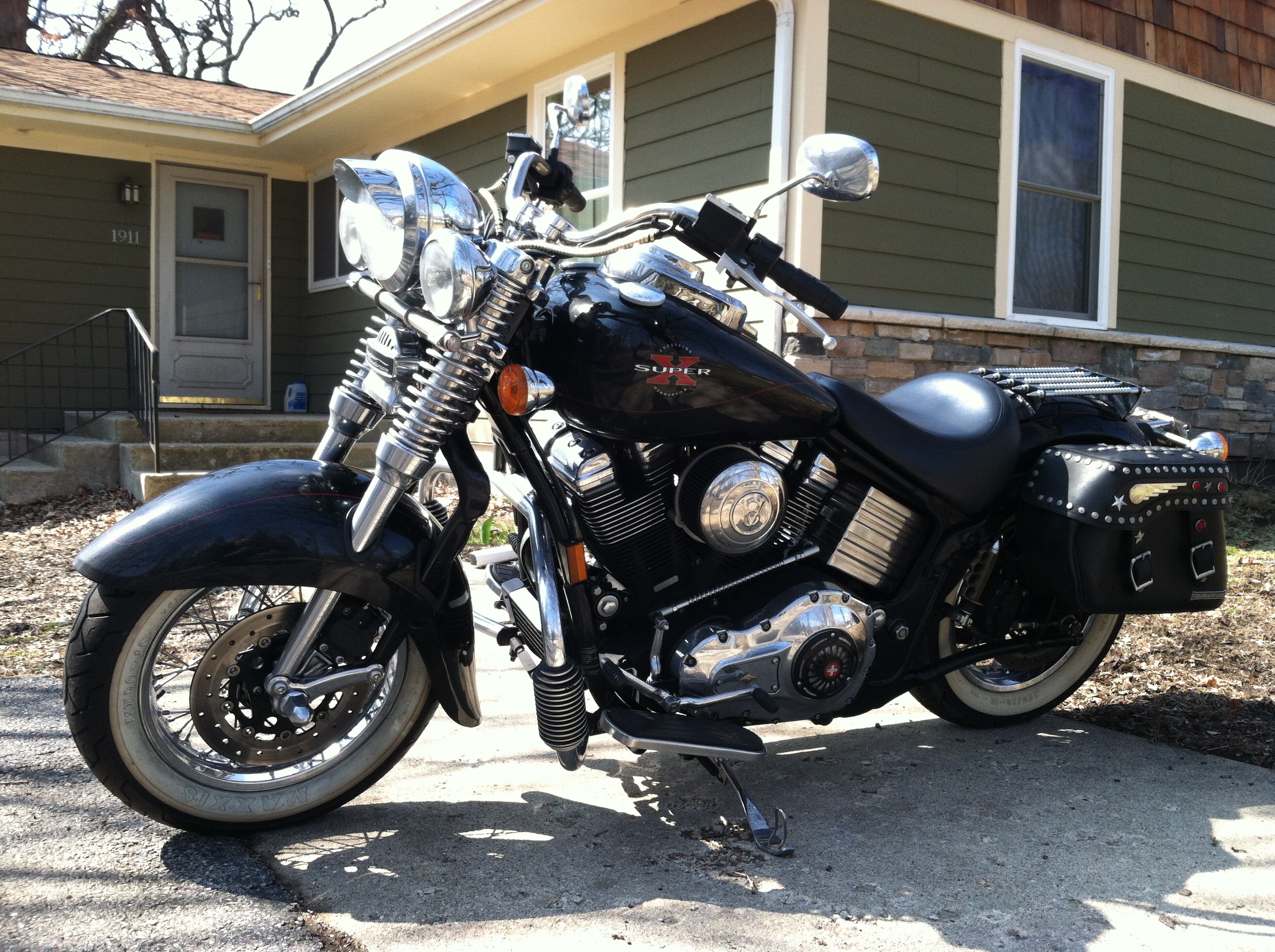 | Modifications/Accessories: | ..Mods & accesories / billet alum.reservoir covers.-Polished timing cover-Black powder coated fender struts. R.fender luggage rack.--Studded factory saddle bags.-Lowered license plate. Custom shift rod--Old H.D. horn cover as a clutch cover.--Hiwaybar holds oil.--2000 style f.turn signal posts.--Cylinders are all black |